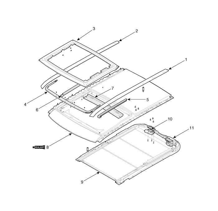 2. Боковой молдинг крыши [RH] 3. Подвижное стекло 4. Дефлектор ветра 5. Декоративная крышка [LH] 6. Декоративная крышка [правая] |