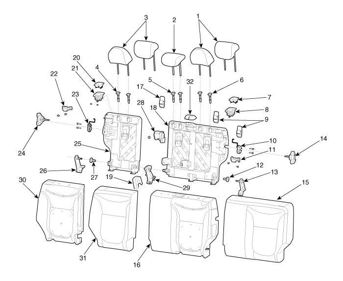 26. Нижний боковой кронштейн заднего сиденья [RH] 27. Петля втулки спинки заднего сиденья [RH] 28. Натяжитель заднего центрального ремня безопасности. 29. Нижний боковой кронштейн заднего сиденья [Центр] 30. Обивка спинки заднего сиденья [RH] 31. Подушка спинки заднего сиденья [RH] 32. Центральная крышка заднего ремня безопасности |