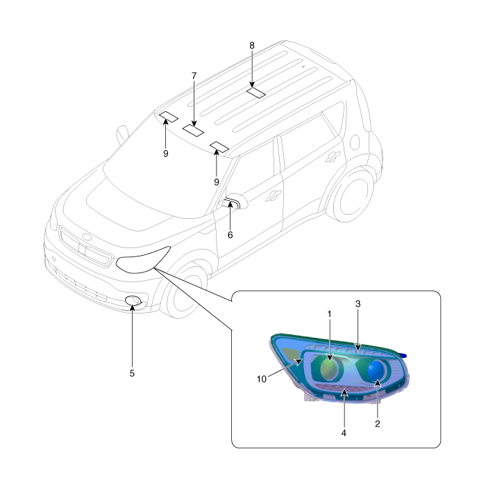 2. Фара головного света (дальний свет) 3. ДХО и габаритный фонарь 4. Лампа указателя поворота 5. Передняя противотуманная фара |