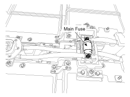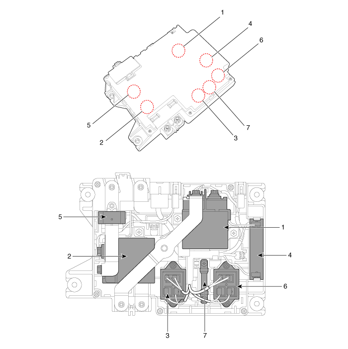 2. Главное реле 3. Реле предварительной зарядки 4. Резистор предварительной зарядки 5. Датчик тока батареи 6. Защитная заглушка 7. Главный предохранитель |