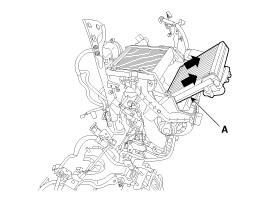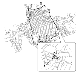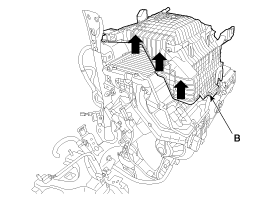 Снимите нижний кожух отопителя (В) после ослабления болта крепления нижнего кожуха отопителя (А).