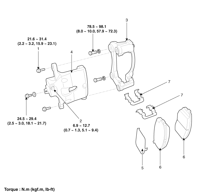 Kia Soul EV: система AHB (активное гидравлическое усиление) / компоненты переднего дискового тормоза и расположение компонентов
