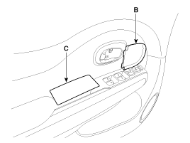 С помощью плоской отвертки (A) снимите колпачок внутренней ручки передней двери (B) и колпачок тяги передней двери (C).