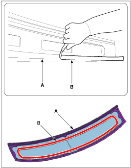 Если переднее стекло (A) используется повторно, используйте лезвие, чтобы удалить остатки герметика (B) вокруг панели кузова.