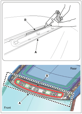 С помощью пистолета для герметика нанесите герметик (B) вокруг панели кузова (A).