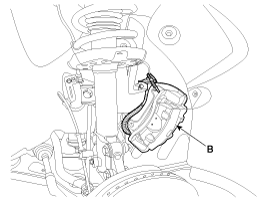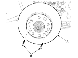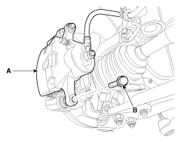 Выверните болты крепления тормозного суппорта (А) и закрепите тормозной суппорт в сборе (В) проволокой.
