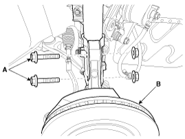Ослабьте болты крепления стойки (А) и снимите узел поворотного кулака (В).