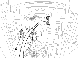 Отсоедините разъем подушки безопасности (А), разъем обогревателя сиденья и разъем переключателя сиденья с электроприводом (В) и разъем замка переднего ремня безопасности (С).