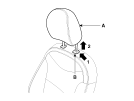 Нажмите на стопорный штифт (B) и вытяните подголовник переднего сиденья (A), чтобы снять его.