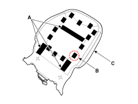 Сняв ленту-липучку (A) и кольцевые зажимы (B) на передней части спинки сиденья, снимите обивку спинки переднего сиденья (C).