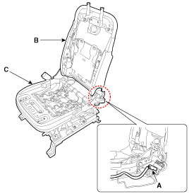 Ослабив крепежные болты, отделите раму спинки переднего сиденья в сборе (В) и раму подушки переднего сиденья в сборе (С).