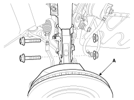 Отсоедините узел передней стойки (А) от поворотного кулака, ослабив болт и гайку.