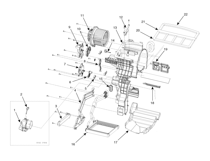 13. Корпус отопителя [левый] 14. Датчик воздуховода 15. Заглушка соединительного фланца 16. Внутренний конденсатор 17. Нижняя изоляция активной зоны испарителя 18. Сборка напольной двери 19. Вентиляционная дверца в сборе [LH] 20. Верхняя крышка кожуха - Термосварка 21. Верхняя крышка кожуха - Термосварка 22. Верхняя крышка кожуха - Термосварка |