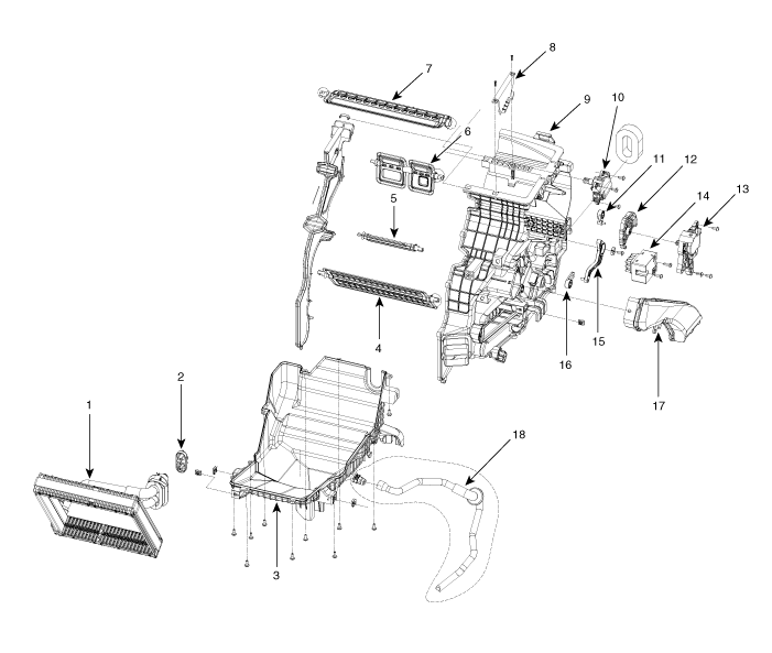 11. Ручка вентиляционной двери 12. Режим камеры 13. Двигатель исполнительного механизма режима в сборе [RH] 14. Двигатель вентилятора с ШИМ 15. Рычаг напольной двери 16. Ручка напольной двери 17. Напольный душ в сборе [RH] 18. Сливной шланг |