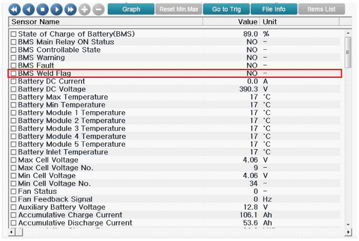 Проверьте состояние повреждения сварного шва BMS в сервисных данных GDS.