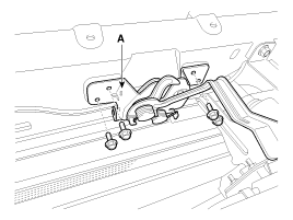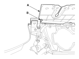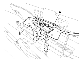 Отсоедините трос замка капота (А) и снимите узел нижнего замка капота (В).