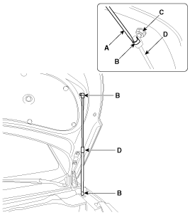 Используя съемник зажимов, отсоедините зажимы и снимите изоляционную прокладку капота (А).