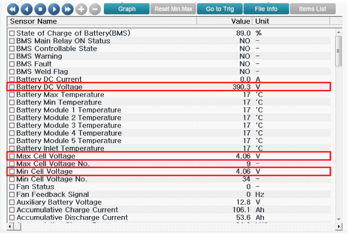 Проверьте Cell Voltage и Pack Voltage в служебных данных GDS.