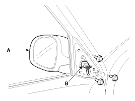 Отсоедините разъем наружного зеркала заднего вида (В).