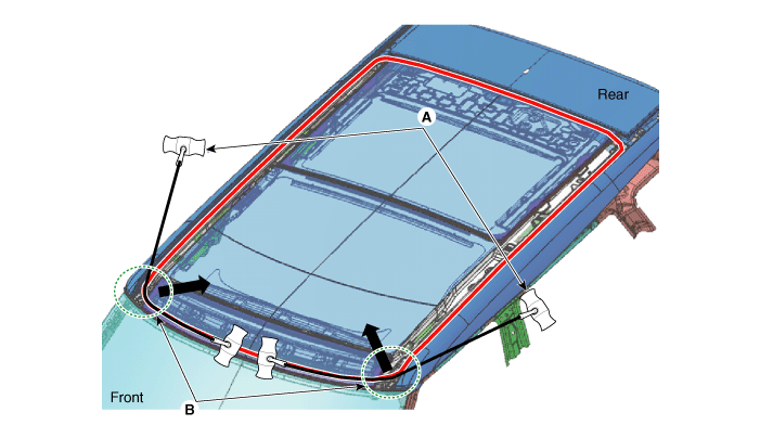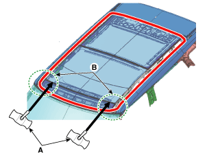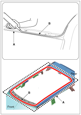 Если панорамный люк в сборе (А) используется повторно, используйте лезвие, чтобы удалить остатки герметика (В) вокруг панели кузова.