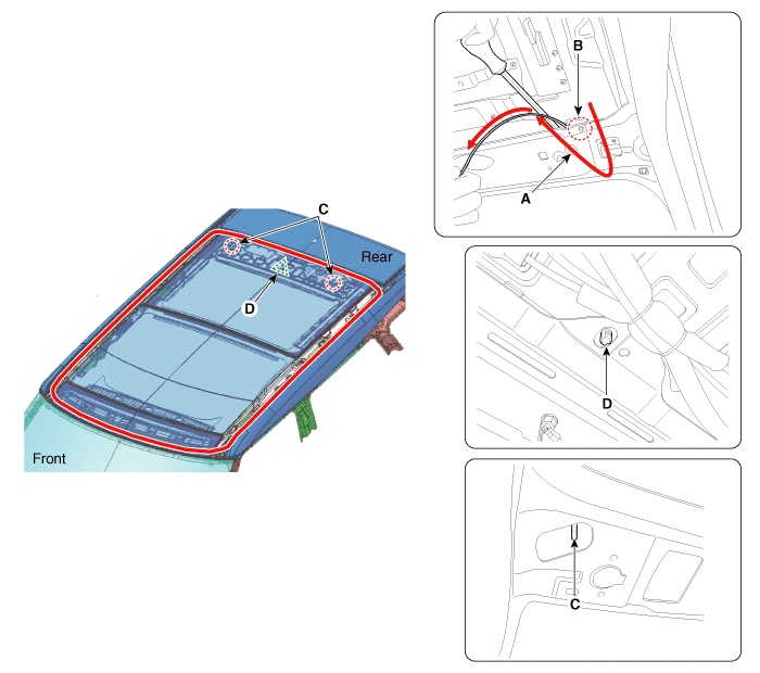 Срежьте остатки герметика на каждой поверхности и снимите панорамный люк в сборе (А).