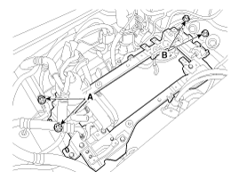 Снимите гайку крепления левого и правого опорных кронштейнов (A, B), а затем снимите силовую электрическую раму (A).