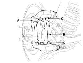 Замените фиксаторы колодок (C) и тормозные колодки (B) в держателе суппорта (A).