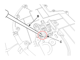 С помощью плоской отвертки (B) потяните вверх стопорный штифт внутренней ручки задней двери (C).