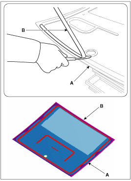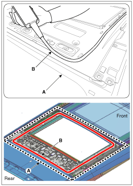 С помощью пистолета для герметика нанесите герметик (B) вокруг панели кузова (A).