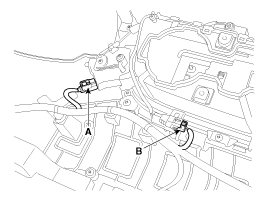Отсоедините сигнализатор открытия крышки дверцы зарядного устройства (A) и разъем лампы крышки дверцы зарядного устройства (B).