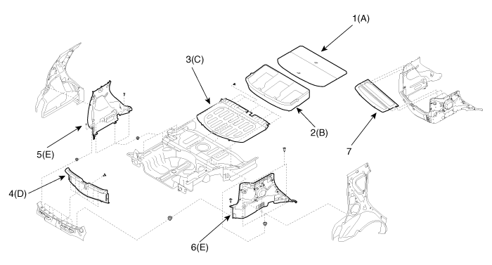 Ослабив крепежные винты, снимите боковую обшивку багажника (Е).