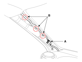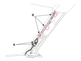 Отсоедините главный разъем обивки крыши (А) и монтажные зажимы (В) на передней стойке.