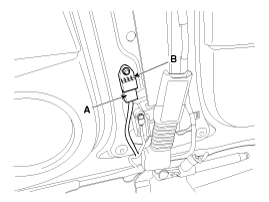 Установите новый датчик бокового удара (В) с помощью болта, затем подсоедините разъем датчика бокового удара (А).