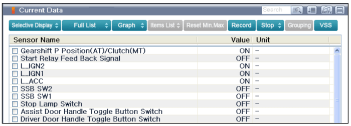 Это меню показывает состояние каждого переключателя на сканере после того, как он был подключен к процессу «текущие данные».