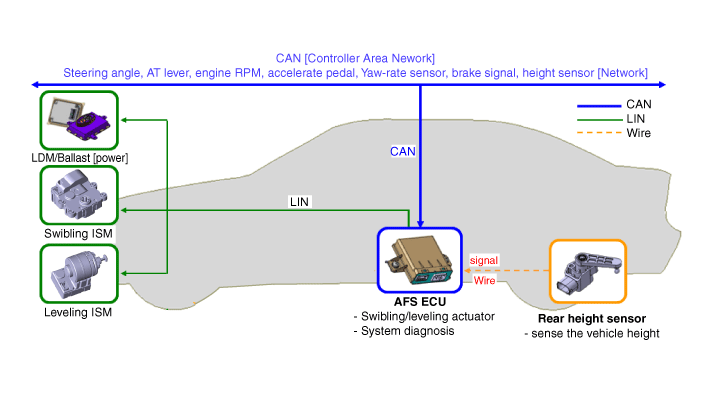 Общий обмениваться данными с блоком AFS по протоколу LIN Надежный контроль помех Не работает вне диапазона номинального напряжения. |