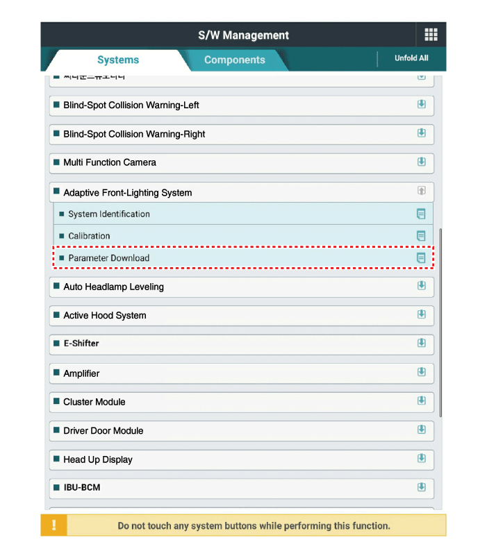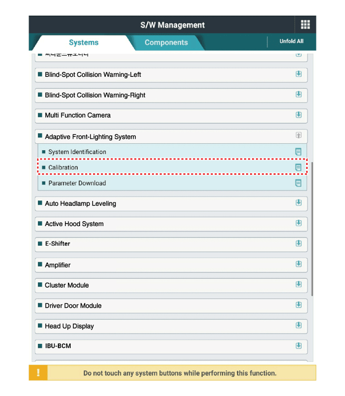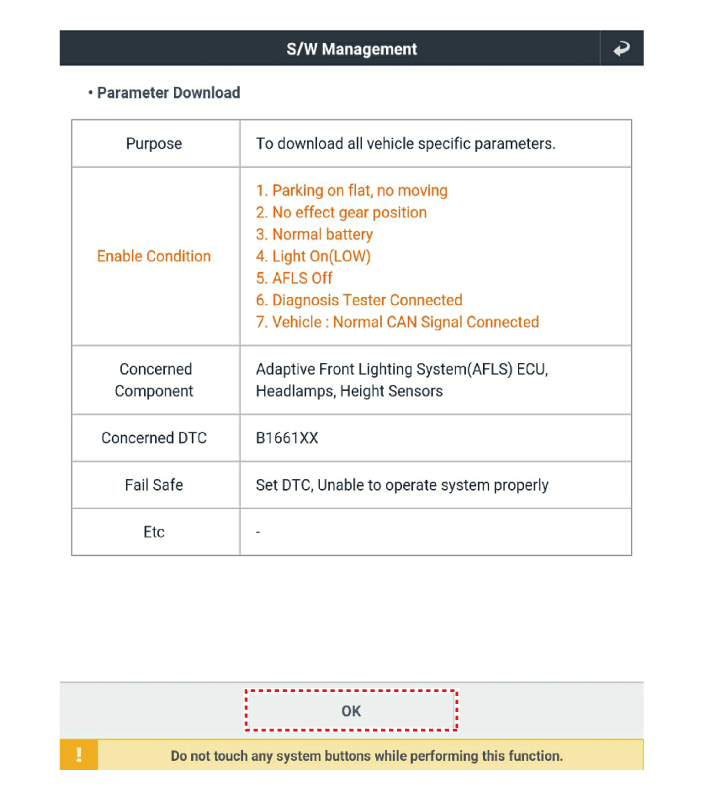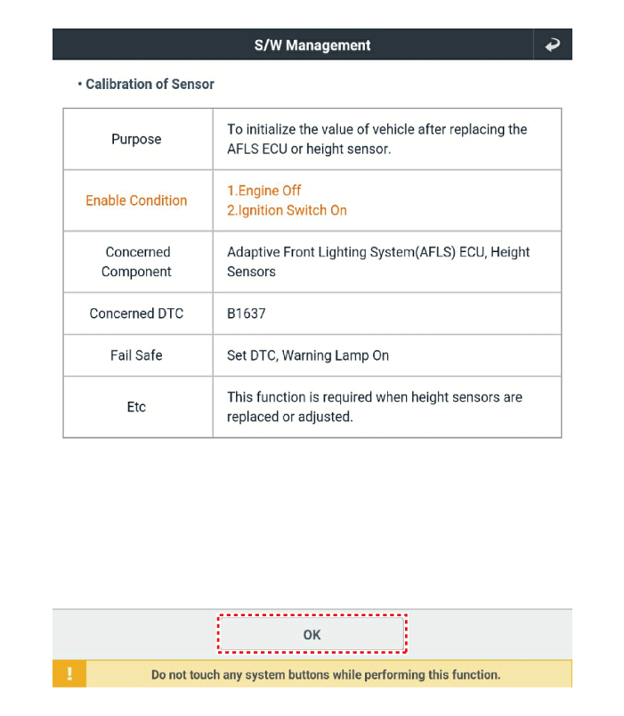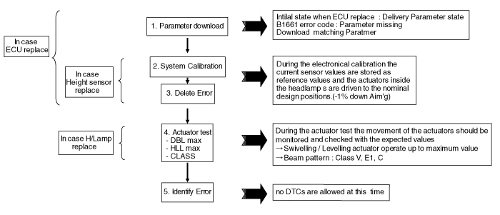 Когда он заменяет ECU AFS или блок H/Lamp или датчик высоты, он работает в настройках Процедура с использованием диагностического оборудования, как указано ниже.