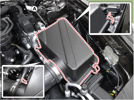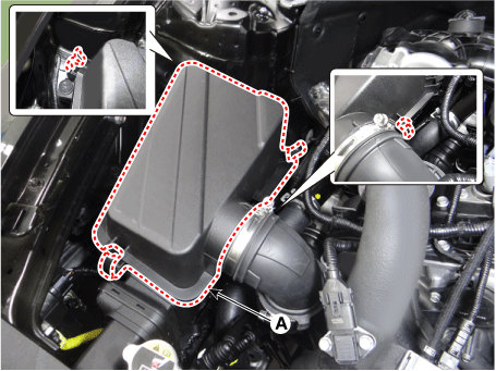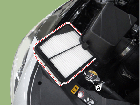 Откройте крышку элемента воздушного фильтра (А), разблокировав зажим. [левый]