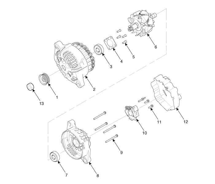 9. Сквозной болт 10. Сборка щеткодержателя 11. Болт щеткодержателя 12. Задняя крышка 13. Гайка |