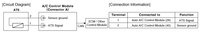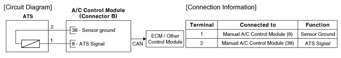 Датчик температуры окружающего воздуха (ATS), установленный на переднем модуле, определяет температура окружающей среды. ECM получает данные о температуре всасываемого воздуха и окружающего воздуха. температуры в то же время, чтобы точно контролировать количество подаваемого всасываемого воздуха через турбокомпрессор. Электрическое сопротивление термистора уменьшается. при повышении температуры и наоборот. Этот датчик имеет отрицательную температуру Коэффициент (NTC) и его сопротивление обратно пропорциональны температуре.