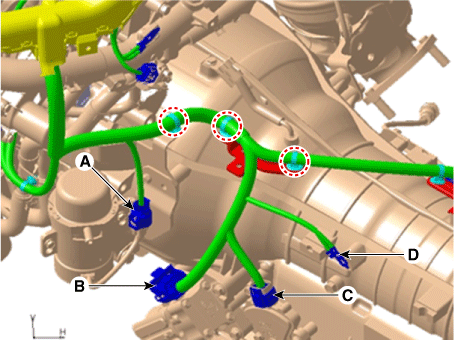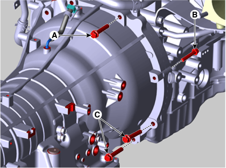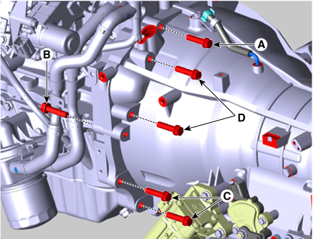 Ослабьте болты крепления коробки передач (A, B, C) и болты крепления стартера (D).