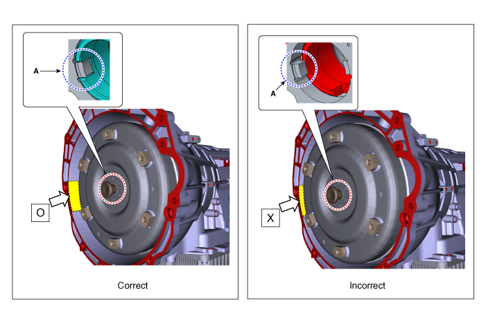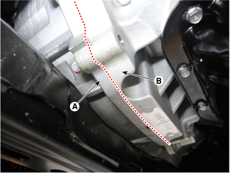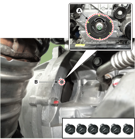 Снимите крышку, а затем ослабьте болты крепления гидротрансформатора. (В-6шт) вращением коленчатого вала (А).