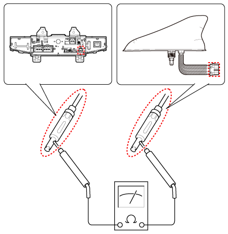 Проверьте целостность цепи между внешними полюсами антенного кабеля. Там должна быть преемственность.