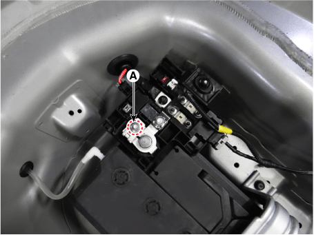 Затяните зажим аккумуляторной батареи (А) на отрицательной (-) клемме аккумуляторной батареи.