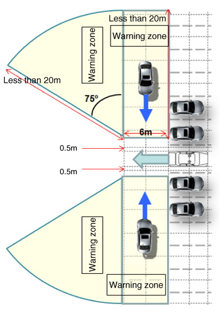 ① Эта функция помогает водителю обнаружить приближающийся автомобиль с задняя и боковая части, которые невозможно определить визуально, когда водитель дает задний ход вытащить автомобиль с места парковки. ② Генерируется предупреждение для целевого транспортного средства, если оно находится в течение 2 секунд. на основе TTC (время до столкновения). Пешеходы не считаются приближающимися целей при предупреждении водителя. (Предупреждение может не генерироваться.)