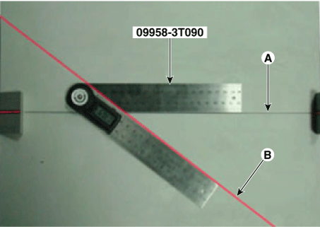 Установите пластину для измерения угла (специальный инструмент: 09958-3T050) в месте где центральный лазерный луч (A) и горизонтальный лазерный луч (B) пересекаются друг друга.
