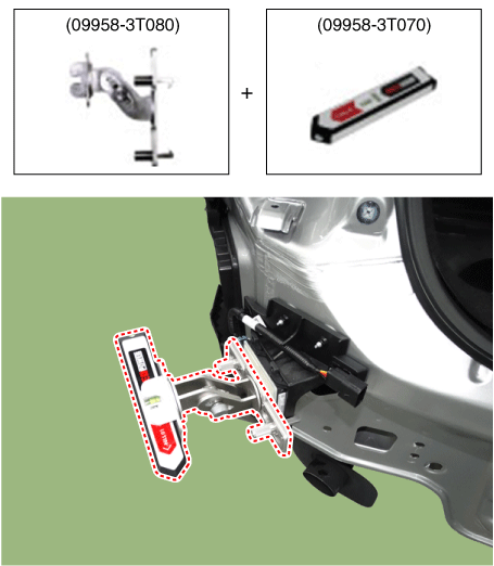 Установите фиксирующий адаптер блока BCW (специальный инструмент: 09958-3T080) на Блок BCW и закрепите лазерный уровень (специальный инструмент: 09958-3T070).