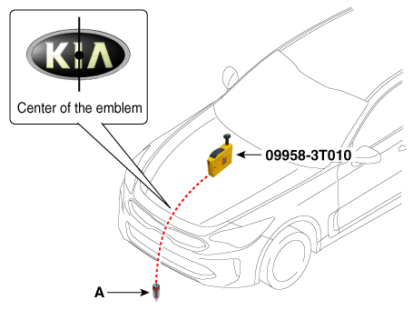 Прикрепите вертикальный отвес (специальный инструмент: 09958-3T010) к капоту и опустите отвес (А) на землю так, чтобы он прошел через центр эмблема.