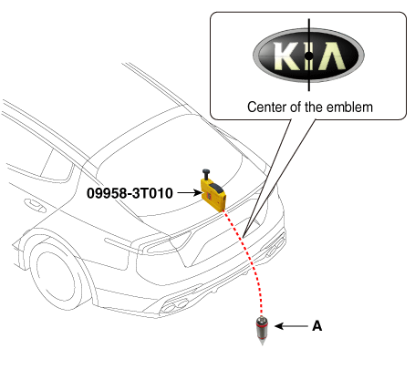 Прикрепите вертикальный отвес (специальный инструмент: 09958-3T010) к багажнику (или задней двери) и опустите отвес (A) на землю так, чтобы он прошел через центр герба.