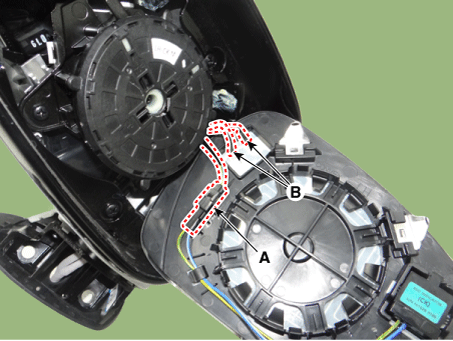Отсоедините разъемы отопителя (B) и разъем индикатора BCW (A). из зеркала.