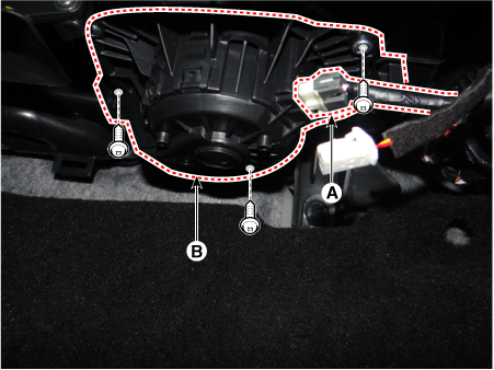 Отсоедините разъем электродвигателя вентилятора (А), затем снимите вентилятор. двигатель (B) после ослабления винтов.